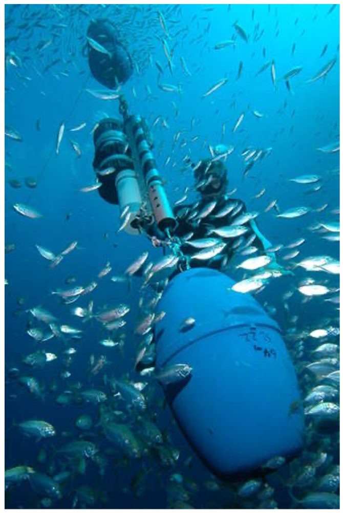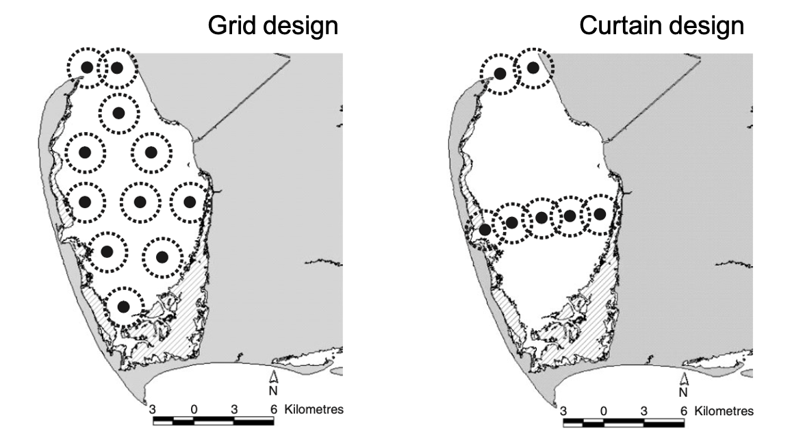 In most cases, multiple receivers (termed an ‘array’) are deployed at fixed locations around a study site, for the full period of the study (i.e., seasons, years), and allow for long-term continuous monitoring. The design of the receiver array depends on the question being explored, the animals being tracked, or the habitats within the study site. Heupel et al. 2006 provides a good review of possible designs of acoustic arrays, including grids and curtains, to track marine animals.